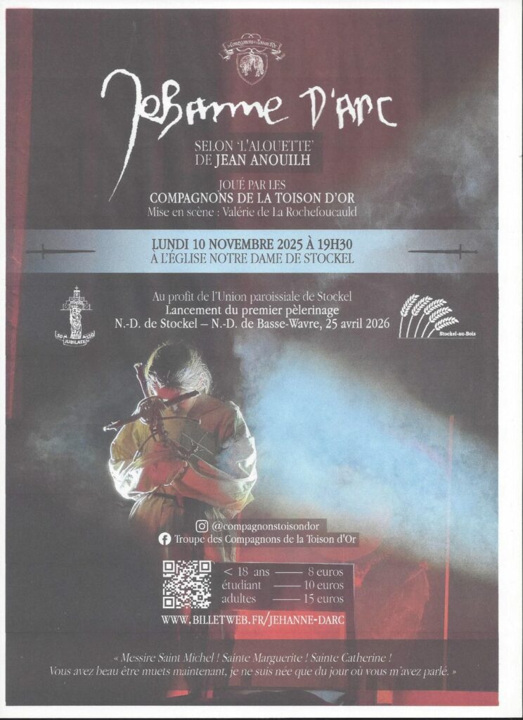 Jeanne d'Arc, l'Alouette de Jean Anouilh, est face à ses juges à Rouen, accusée de sorcellerie. Le promoteur, l'inquisiteur, l'évêque Cauchon l'interrogent sans relâche. Assistée par ses Voix, sa vertu de Force et Notre Seigneur, Jeanne résiste. Les flash back avec le cynique Charles VII, le rustre Seigneur de Vaucouleurs, comme ceux avec son père désespéré et violent, secouent cette pièce unique qui déchire le ciel de l'histoire des Saints et de l'Eglise. Anouilh porte ce drame historique avec une impertinence, une force et des mises en situation toujours surprenantes qui nous poussent dans nos retranchements. La troupe des Compagnons de la Toison d'Or est née en 2020 avec la reprise des "Mémoires de Ponce Pilate" jouée 15 fois dans théâtres et cathédrales et écrite par Valérie de La Rochefoucauld, qui porte ce projet comme une école de vie. La troupe d'aujourd'hui se compose de quatorze universitaires qui conjuguent leurs études avec cet engagement exigeant, en portant haut toute la force du théâtre chrétien ! (from Cathobel)